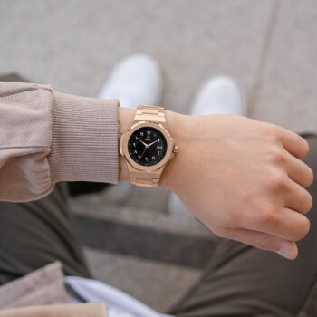 The DayTrip men’s watch in Rose Gold – This watch is made of the finest quality 316L stainless steel, has a stainless steel band with removable links and a butterfly clasp. The watch has a brushed finish on the case and band. This model is powered by a Japanese quartz movement by Seiko with time and date function. The dial is black in colour, and has complimenting gold accents. The hour markers and hands are slightly reflective . The DayTrip is a compact and tough men’s watch with a diameter of 40mm and a thickness of 11mm. The DayTrip is also waterproof up to 100 metres so swimming with the watch is no problem at all. With an extended 2-year warranty, you are also assured of a high-quality watch you will enjoy for a long time.